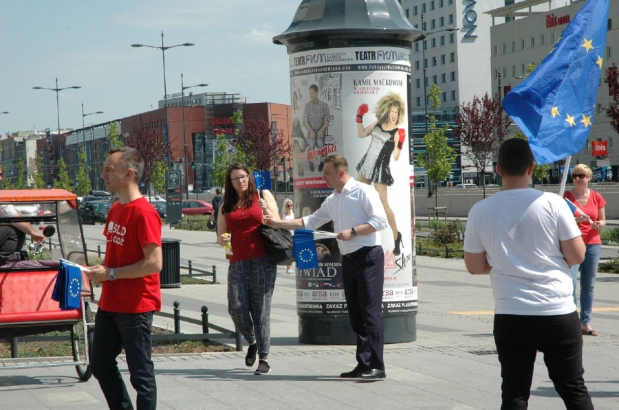 Politycy i działacze łódzkiego SLD nie zapomnieli o Dniu Unii Europejskiej. Wspólnie z przedstawicielami Nowoczestnej rozdawali mieszkańcom Łodzi flagi unijne.