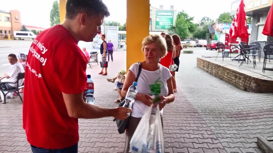 "Przypominamy mieszkańcom Zgierza, że upał może być niebezpieczny, dlatego trzeba pamiętać o kilku podstawowych zasadach, takich jak noszenie nakrycia głowy, możliwie jak najkrótsze przebywanie w pełnym słońcu i oczywiście picie dużej ilości napojów. Właśnie dlatego mamy dziś dla mieszkańców butelki wody, która pomoże przetrwać gorączki" - powiedział Łukasz Kubiak sekretarz SLD w powiecie zgierskim.